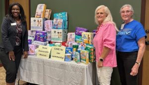 TDW-EC collected and donated baby items to Waxahachie CARE for mothers in need. Shown are Deidre Hamid, Executive Director of Waxahachie CARE; Julie Mendenhall, Community Outreach Chair; and Nancy Post, TDW-EC President.
